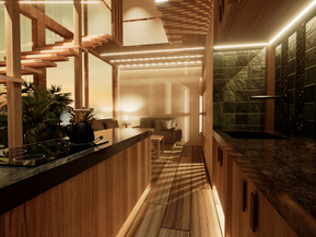 We wanted to create a space that promotes human connections and well-being. Our project involved designing an apartment for two elderly individuals by connecting two apartments and creating a shared living area. We believe that no one should feel lonely in their last days, and our concept of using wood grids to divide the space not only creates privacy but also diffuses the light, resulting in a warm and inviting atmosphere. The caretakers are on the top floor, which designed to be open, providing the caretaker with a clear view of the lower level. This feature ensures that the caregiver can monitor the residents' activities and respond promptly to any needs.
